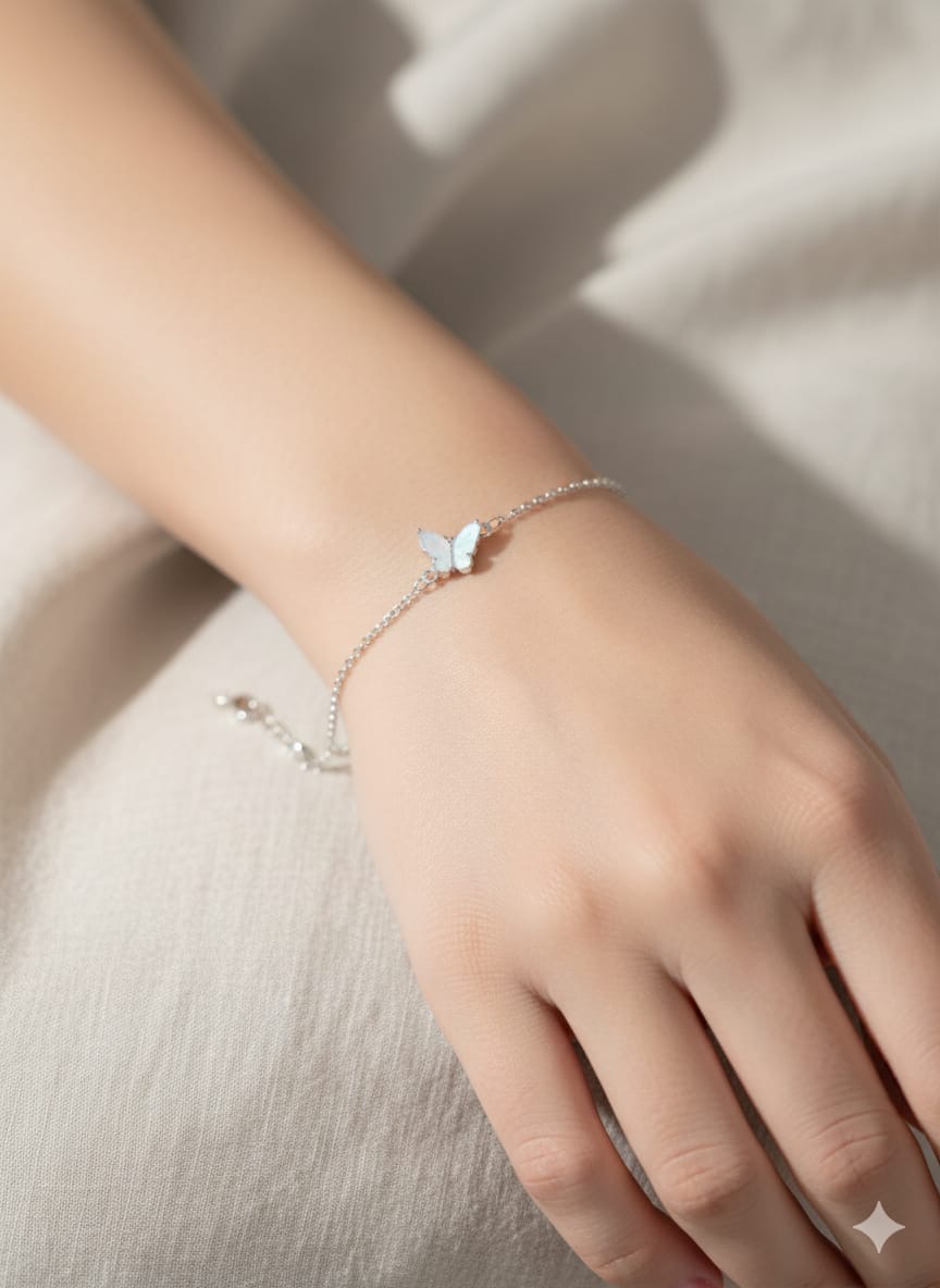 This exquisite bracelet captures the beauty and grace of nature with its central butterfly motif. The charm is crafted from iridescent mother-of-pearl (or a similar shell/epoxy material), giving it a subtle sheen that shifts beautifully in the light. The charm is suspended on a thin, high-polish chain in a silver tone, creating a dainty, barely-there aesthetic.