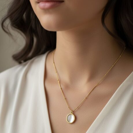 The meticulously polished gold finish adds a luxurious touch, while the upper arc features delicate shimmering stones for extra brilliance. Designed to sit perfectly on the neckline, this pendant enhances both casual outfits and special-occasion looks.