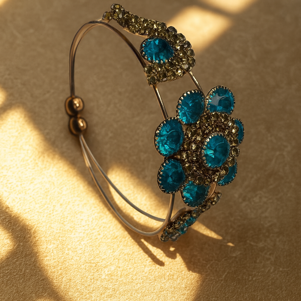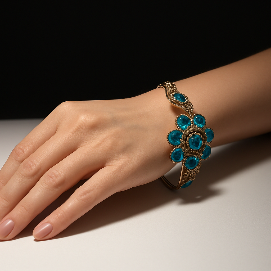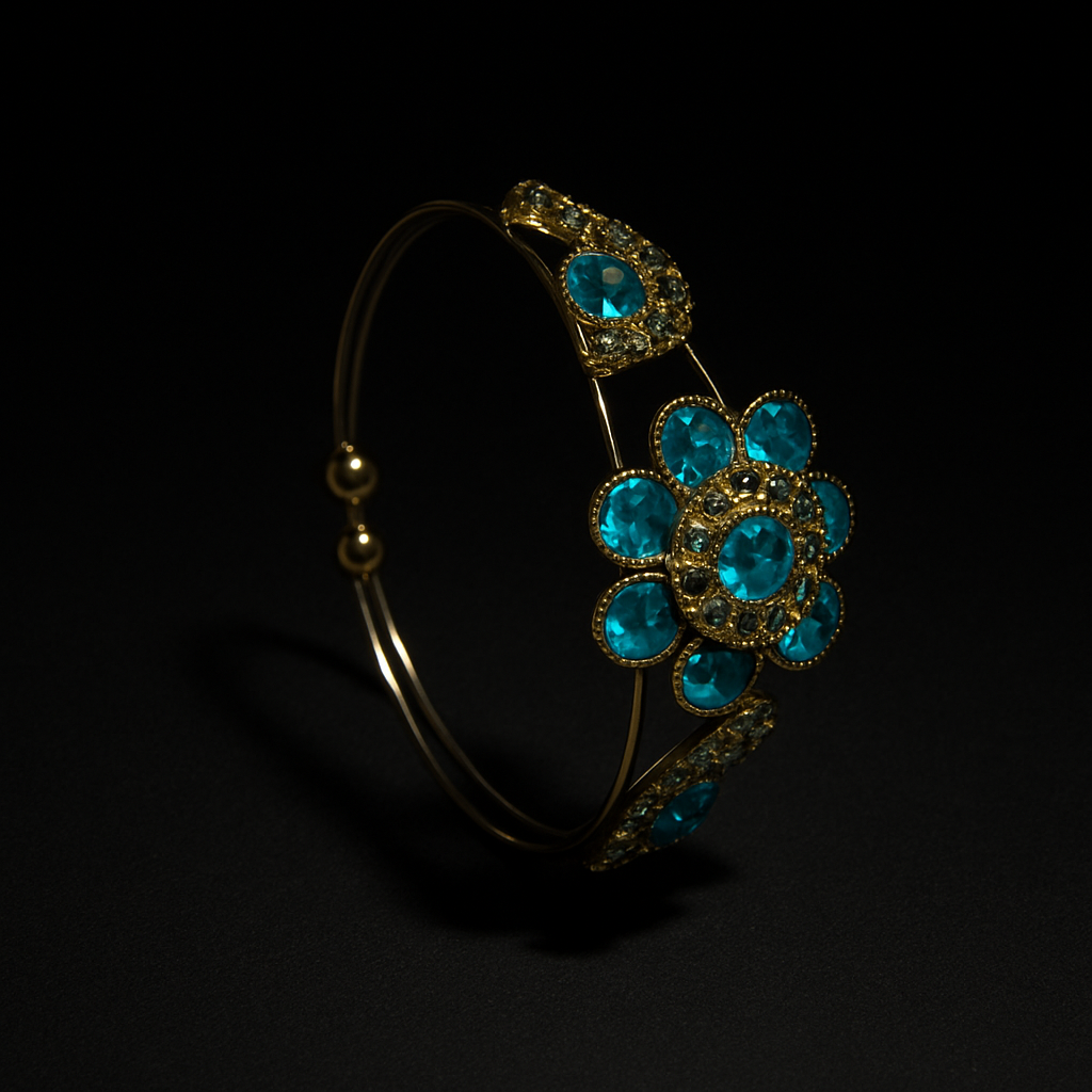 Inspired by nature’s radiant elegance, the Azure Blossom Bracelet captures the essence of sophistication and charm. Crafted with shimmering turquoise-blue stones set in a floral design, this piece reflects a perfect balance of artistry and grace.