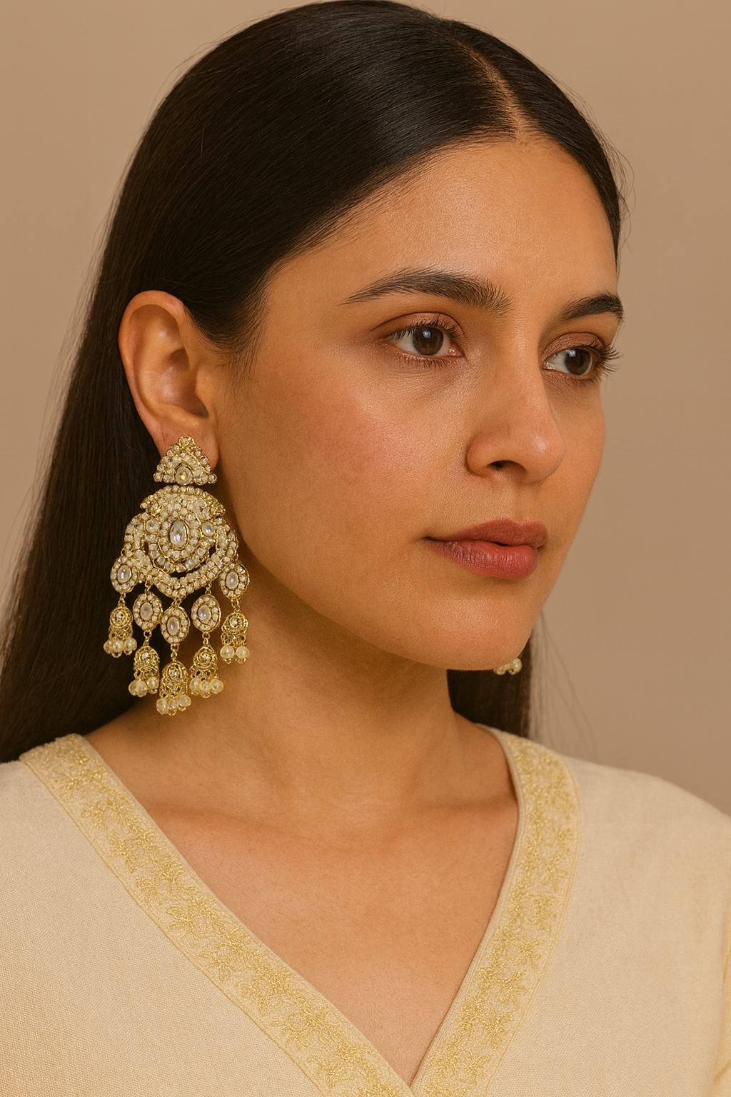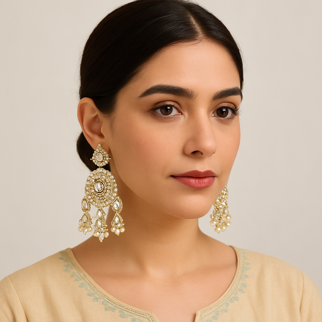 Step into elegance with the Pearl Majesty Chandbali Earrings, designed to add a royal charm to your festive and bridal looks. Crafted with a gold-plated base, these earrings feature intricate Kundan detailing and are adorned with lustrous pearls that create a perfect balance of luxury and tradition. The medium-sized design ensures a graceful statement without overpowering your look — ideal for weddings, festive celebrations, and ethnic gatherings. Pair them with traditional outfits to radiate timeless sophistication.