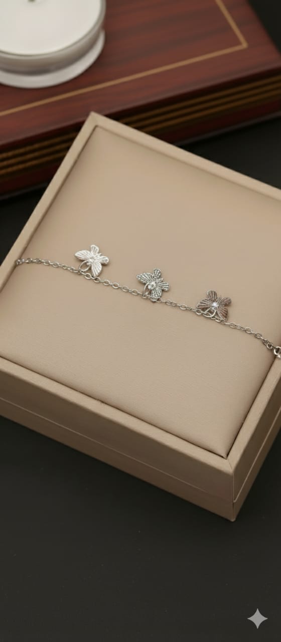 A chic and modern silver-tone chain bracelet featuring a sequence of three intricate flower or butterfly-shaped station charms. The central charm is accented with a small, sparkling crystal for a touch of brilliance. It’s perfect for layering or as a subtle, elegant standalone piece.